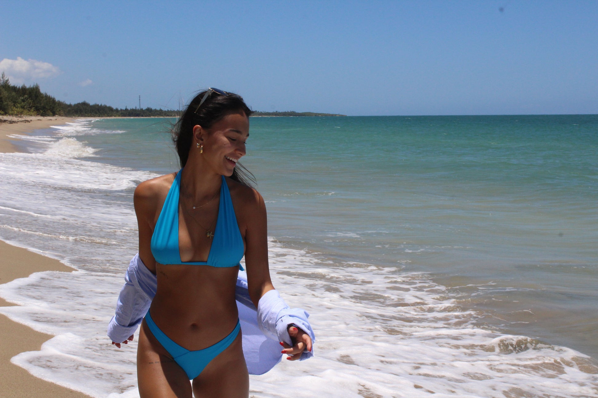 The Santorini Multi Top shines in brilliant turquoise, reflecting the freshness of the Caribbean sea. Its versatile design adapts to various styles and occasions, adding a modern and sophisticated touch to any look. Perfect for those wanting to stand out with elegance at the beach.
